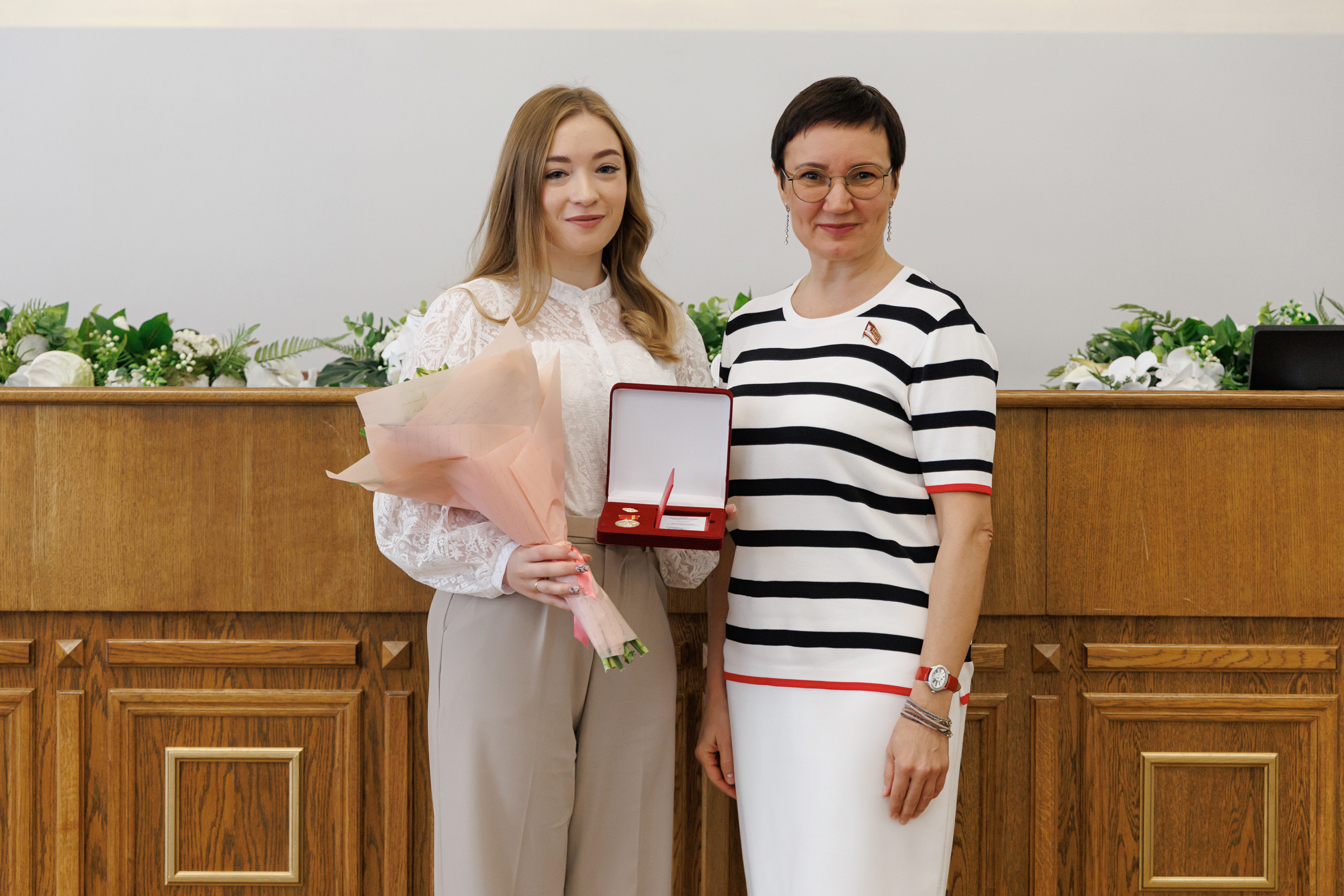 Заместитель председателя комитета по социальной политике Елена Тарасова (справа) вручает Елене Подшиваловой почётную награду./ Фото: Архив Елены Подшиваловой